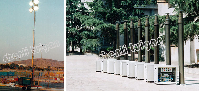 QSG多節氣動照明升降桿,是我公司自行研制設計開發的新產品。該產品結構合理、簡單、升降平穩自如,體積小、重量輕、外形美觀、操作方便,維修保養容易,使用安全可靠,并可任意控制升降高度。廣泛用于公安、消防、通訊、機場、港口、高速公路搶修、高爾夫球場和各種體育運動比賽場所,特種部隊的可移動式野外作業及照明光源。該產品可安裝在汽車和手推車上,配上發電機或電瓶,供停電時應急照明,效果十分理想。多節氣動升降桿可分2-6節,升高3.5-9.5米,用電電壓DC12V、DC24V、AC220可供用戶選擇,也可根據用戶要求制作。用戶可根據具體需要訂貨,控制升降可采用手控、電控、或遙控,用戶在訂貨時需加說明。
